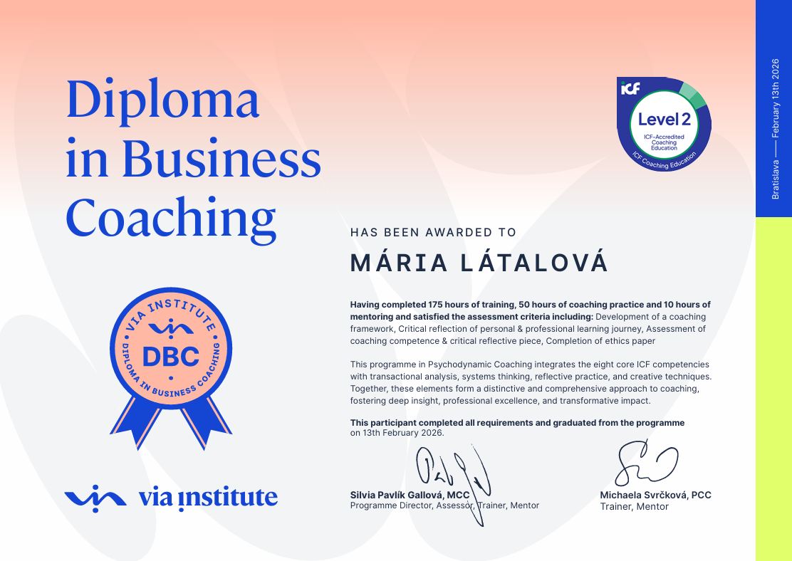 - Výcvik v psychodynamickom koučovaní (235 h.)